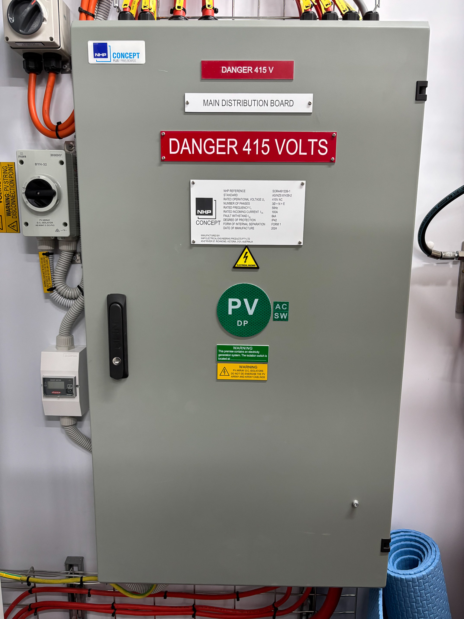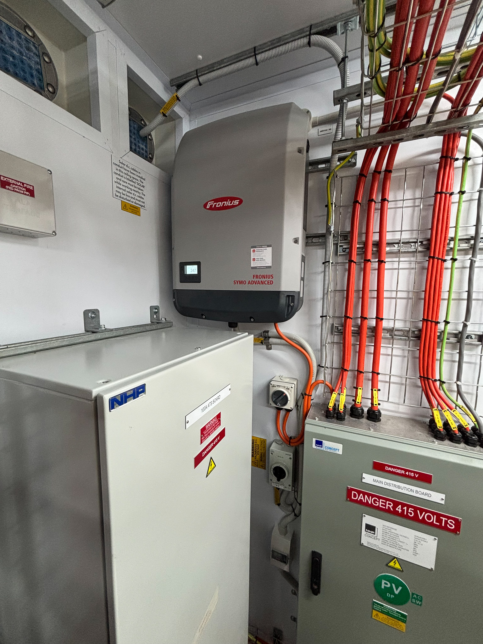 Main incoming utility power supply, including a meter box and a 20.64kW solar system to supplement the incoming PUB power supply in Tarawa.